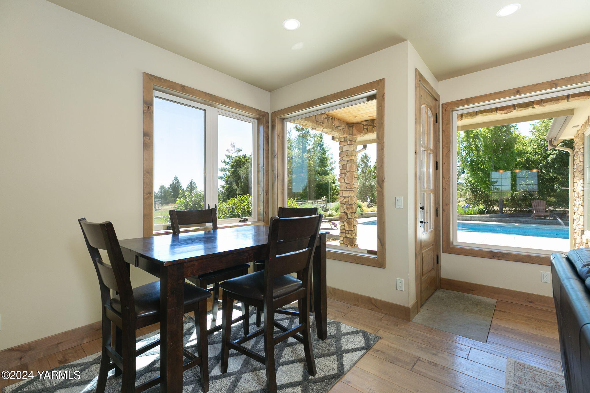 Nestled on 4.35 acres, this home is a peaceful escape brimming with possibility. This unique opportunity features a stunning main house, a beautiful barn converted to a finished event space + potential living/guest space and room for animals or other hobbies. As you walk up to the main house, you're welcomed by the beauty of the stone exterior and thoughtful landscaping. Inside, wood floors, high-end finishes and a stone fireplace add warmth and character to the living space. Upstairs, you'll find 4 bedrooms, 2 newly updated bathrooms and beautiful views. Step out back to find a fiberglass saltwater in-ground pool with a brand new Coverstar automatic safety cover. The pool is surrounded by a large patio, providing plenty of room for fun and relaxation. The true gem of this property lies in the beautifully converted barn. The lower level of this multi-functional space features a commercial sink/prep area, an industrial freezer (perfect for storing Aronia Berries), an ADA-compliant bathroom, a charming tasting room and additional storage rooms. The upper level of the barn is a 1570 sq ft bonus space with breathtaking views to the west and features a beautiful open space/great room, a kitchen, two rooms, bathroom/laundry and a deck - the ideal guest retreat or a private escape. The property is fully irrigated and fenced, and cross fenced for horses or other livestock. The area around the main house and pool is landscaped with mature trees, which adds to the peaceful ambiance. Come check out all the opportunity that awaits with this incredible property!
